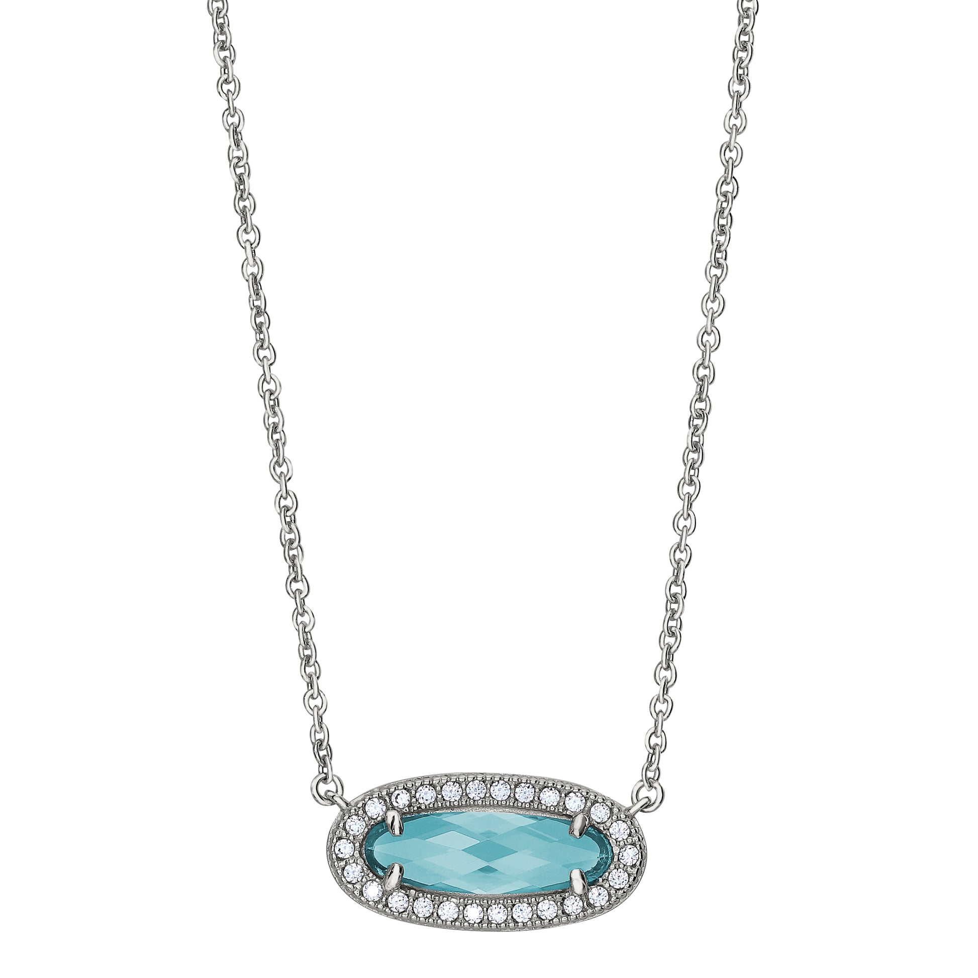 Elevate your style with our platinum finish sterling silver oblong pendant. Showcasing a central simulated London blue topaz surrounded by sparkling simulated diamonds, suspended on a 16-18 adjustable chain, this pendant exudes sophistication and glamour, perfect for adding elegance to any neckline or occasion